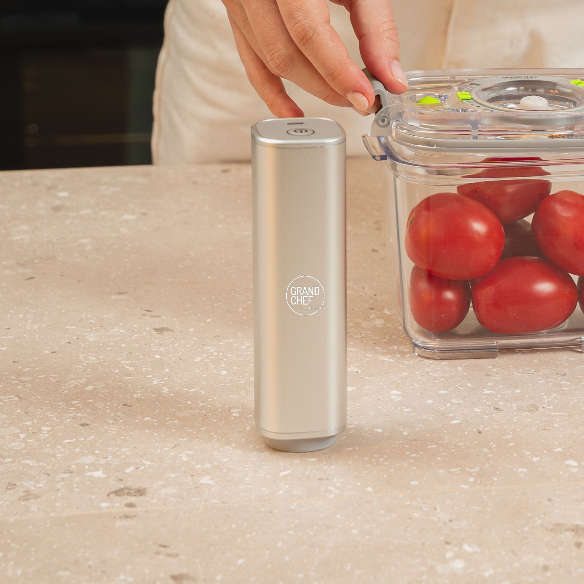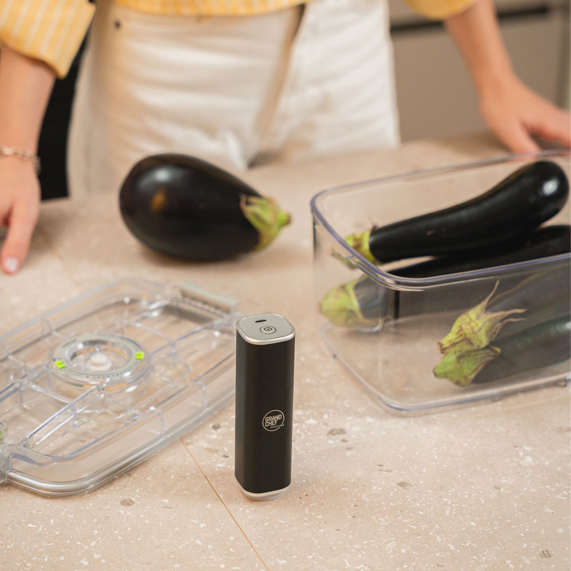 La pompa elettrica EvoFresh elimina l'aria dai contenitori con un semplice tocco, creando un ambiente sottovuoto perfetto anche nei contenitori XL. Niente più fatica con le pompe manuali: basta premere un pulsante e il sistema fa tutto da solo. Questo significa che grandi quantità di frutta, verdura, formaggi, salumi, preparazioni culinarie e batch cooking rimangono freschi fino a 5 volte più a lungo rispetto ai metodi tradizionali.