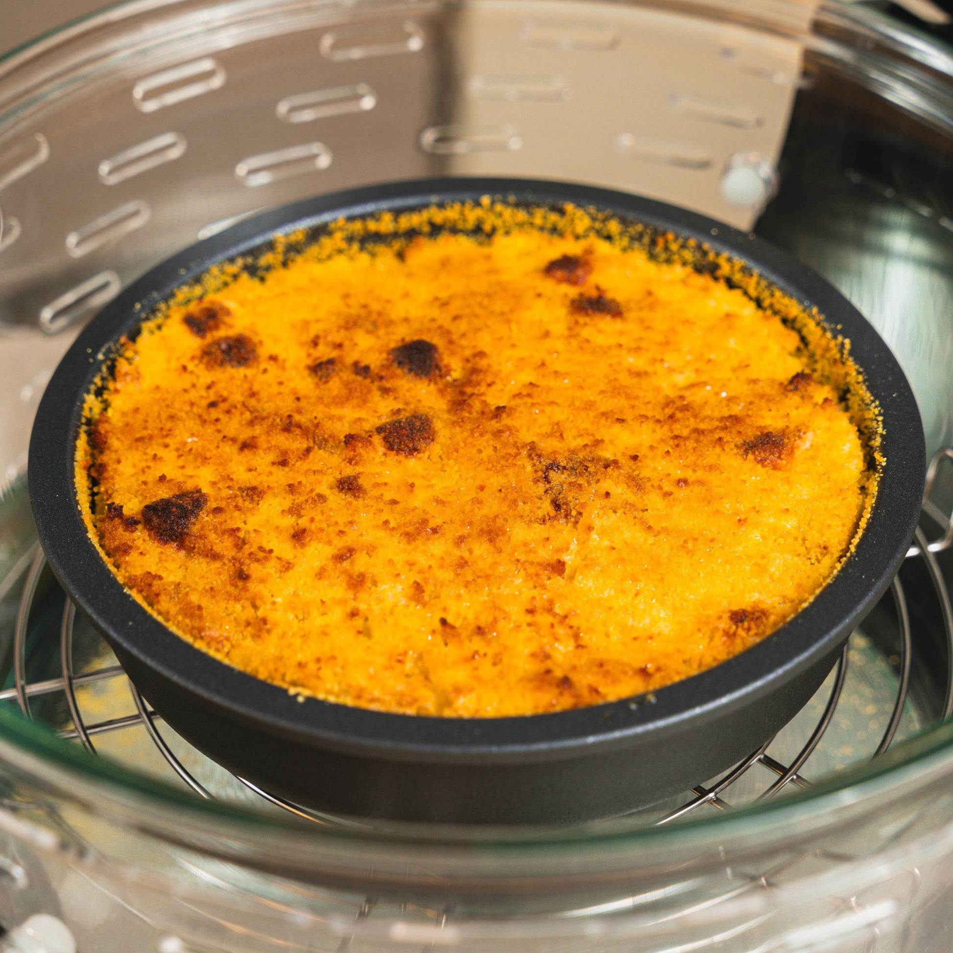 Il fondo strutturato a semispirale canalizza l’aria in modo controllato, migliorando la distribuzione del calore e favorendo una cottura uniforme sia nel robot Grand Chef Evolution che in altri forni ventilati.